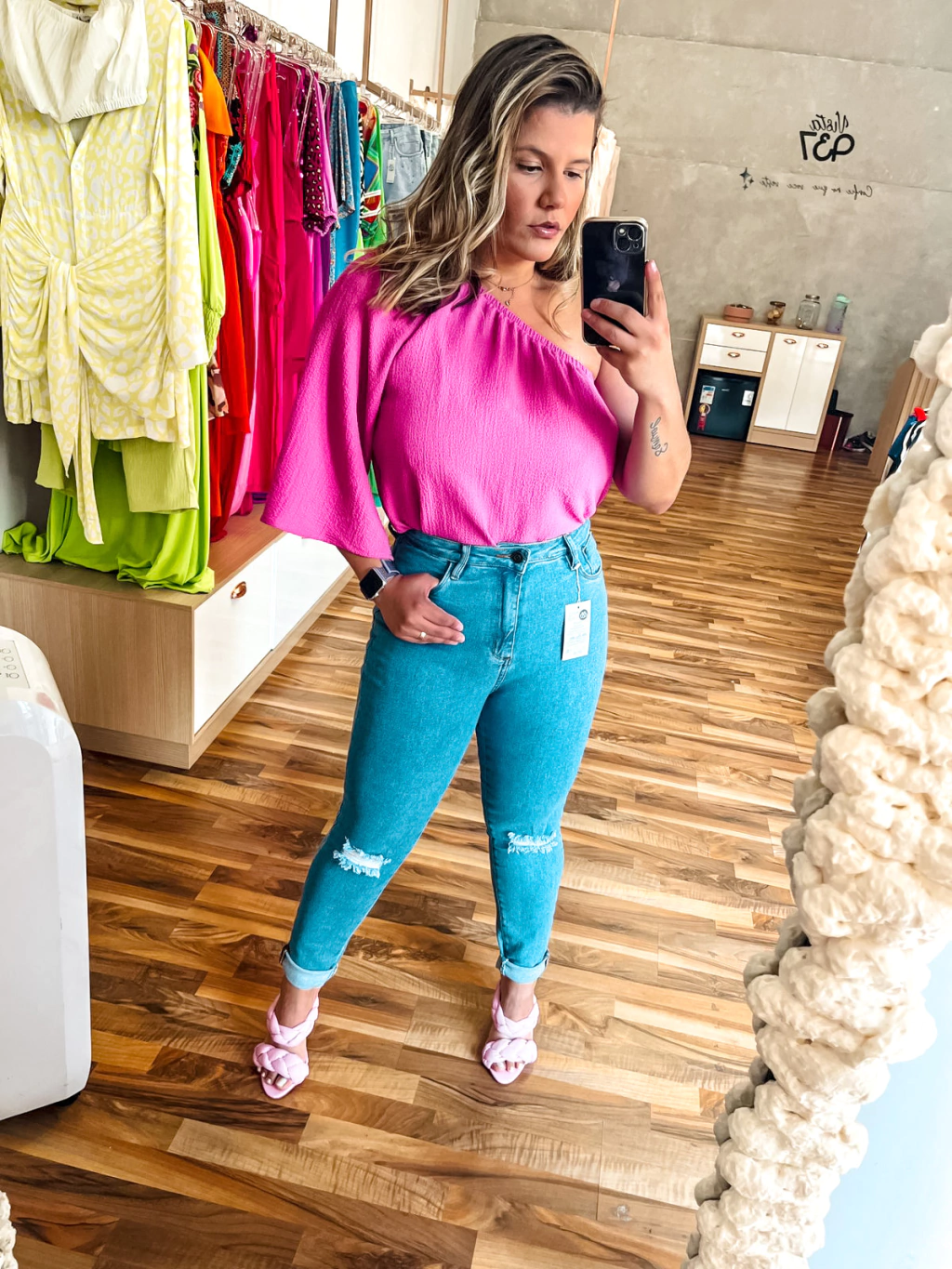 Blusa em crepe texturizado, manga unica.