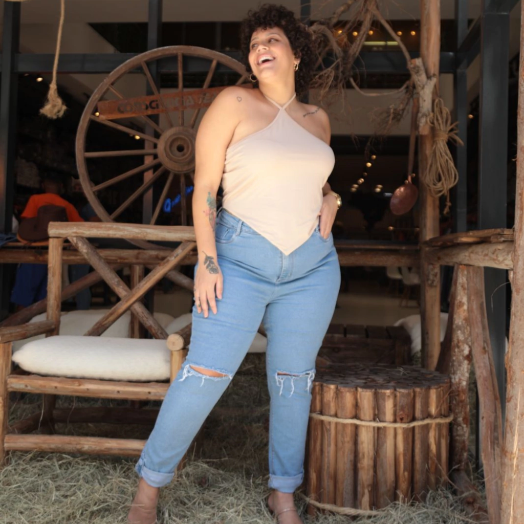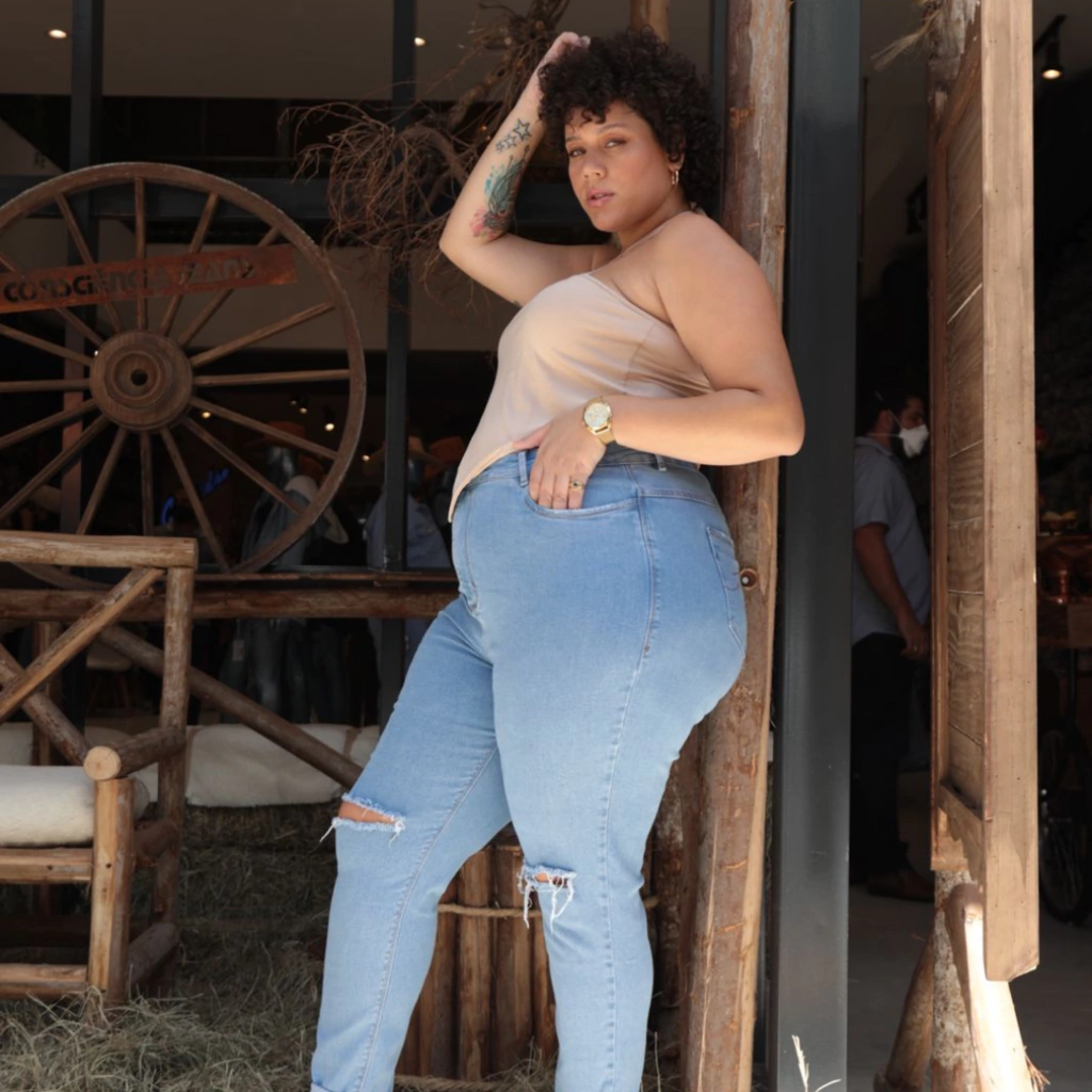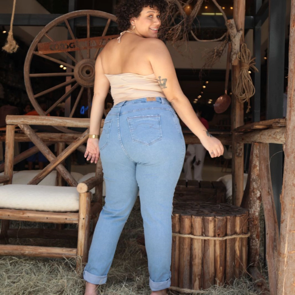 Calça Jeans lavagem clara,cintura alta, possui bastante lycra, martingale na barra com botões revestidos.