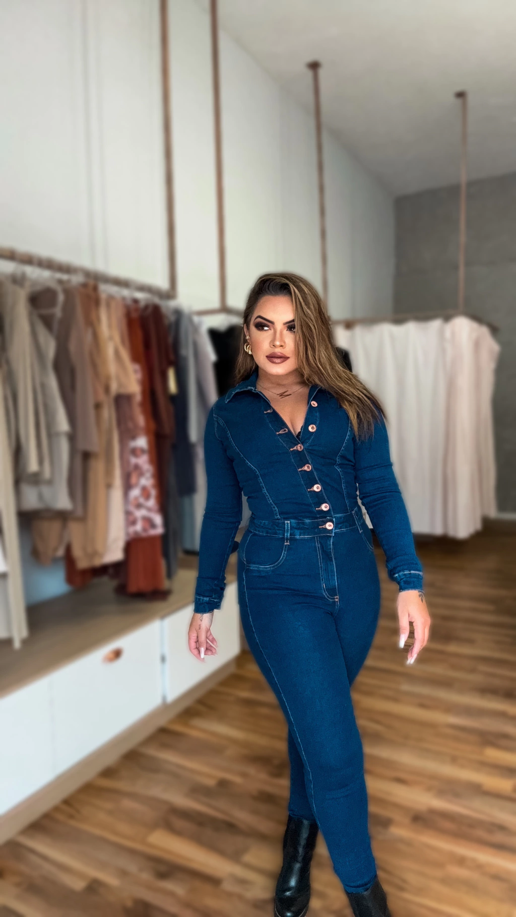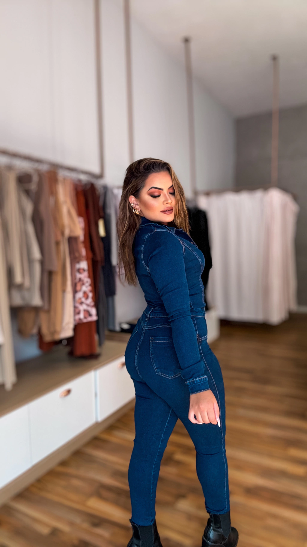 Macacão Jeans modelo Skinny, bem justinho ao corpo.