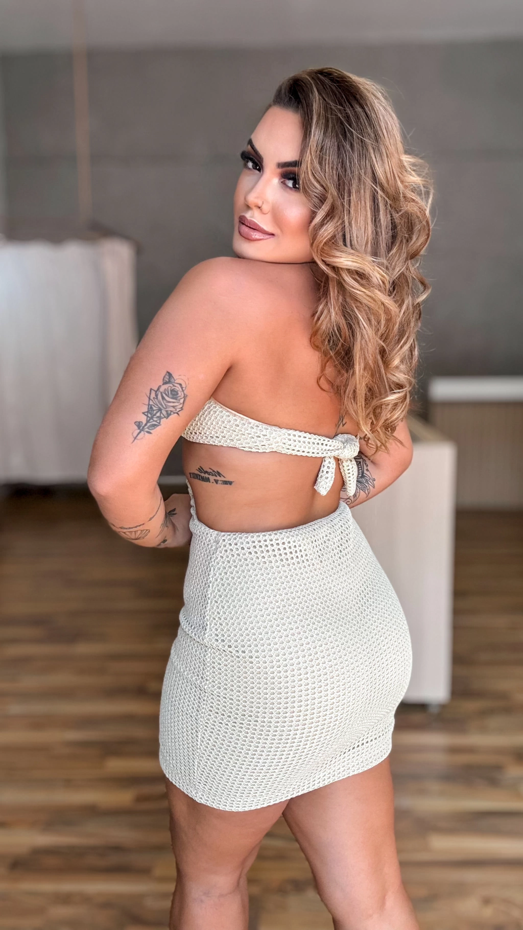 Vestido em malha crochê, todo estruturado.