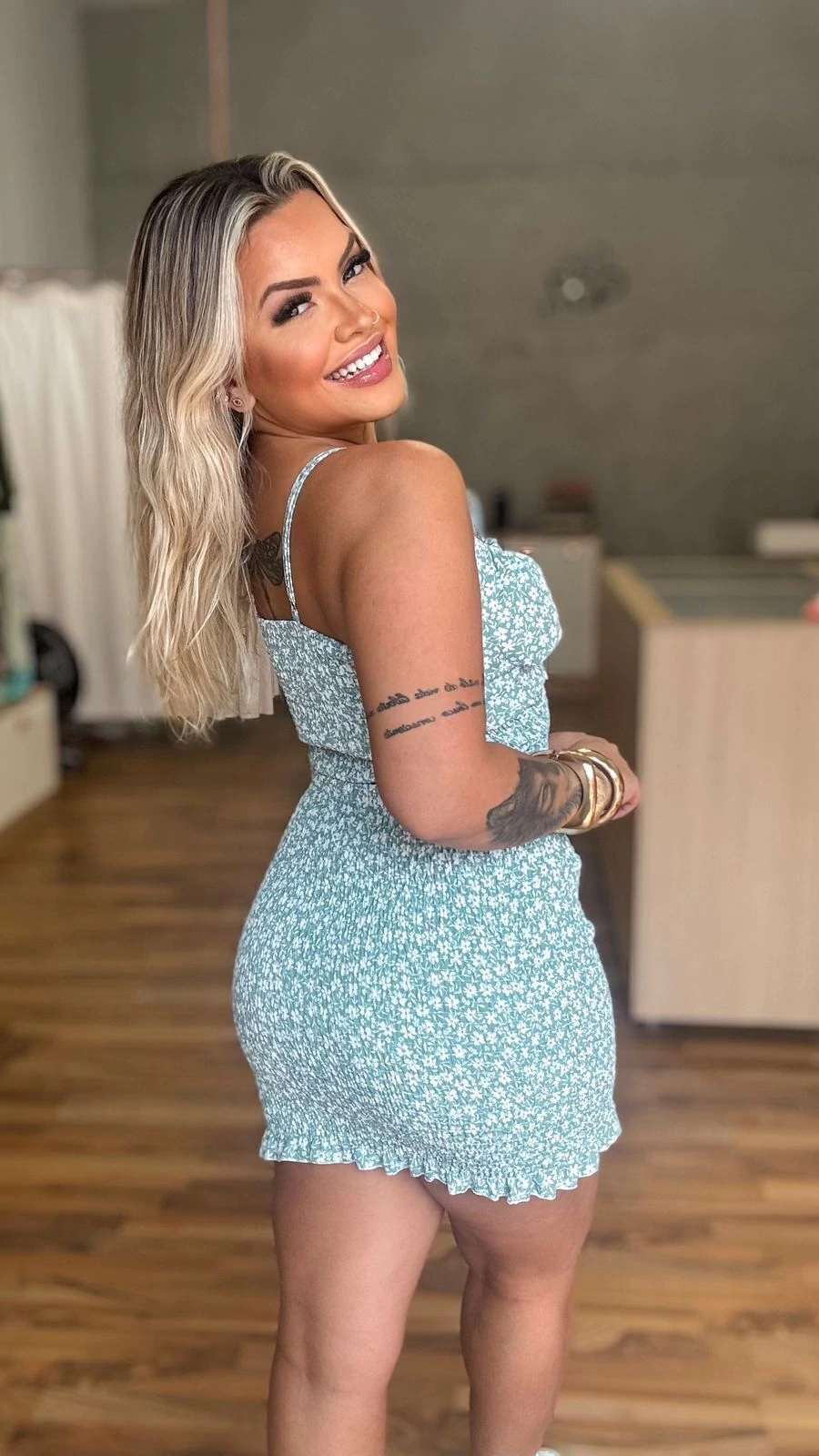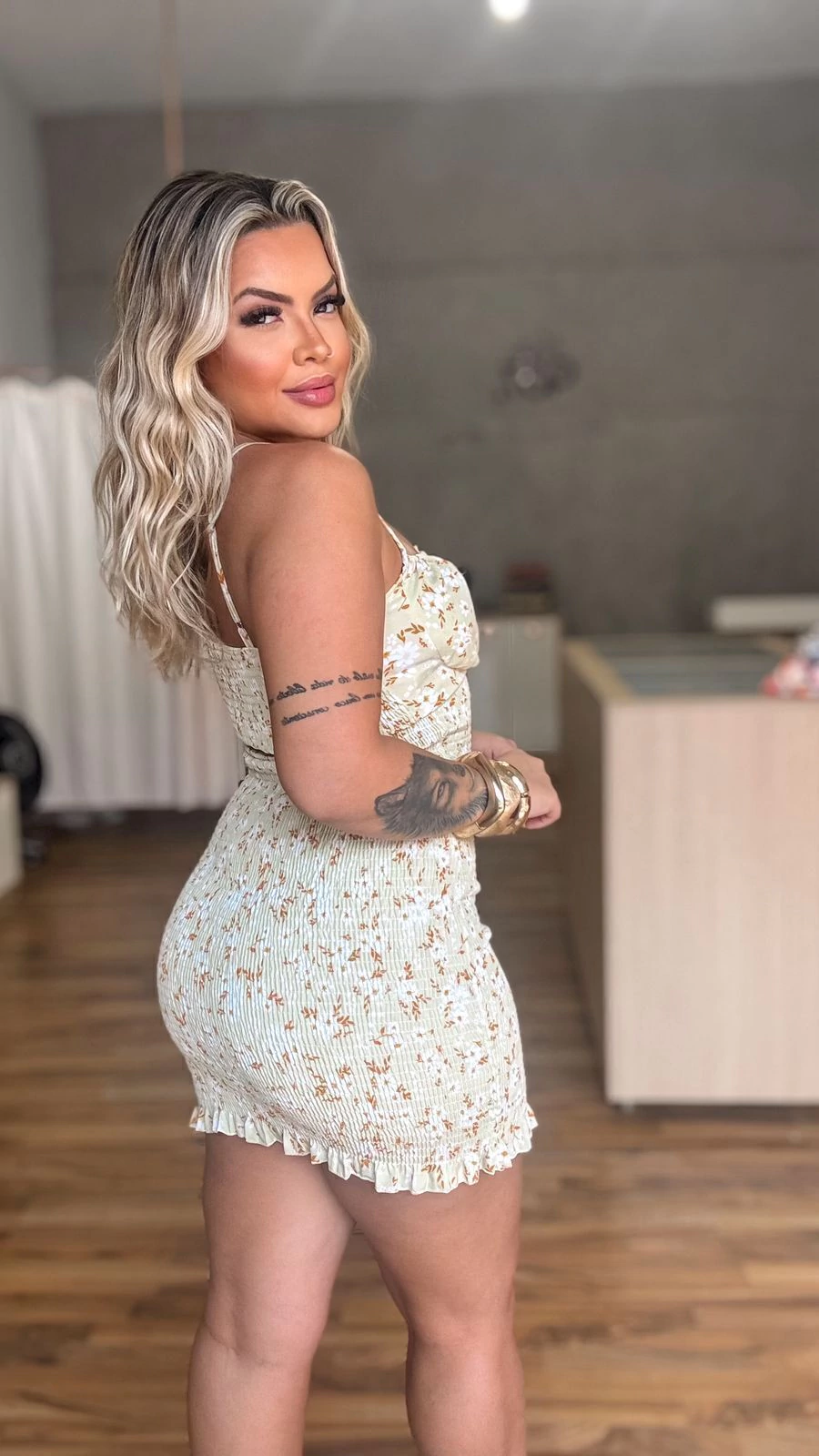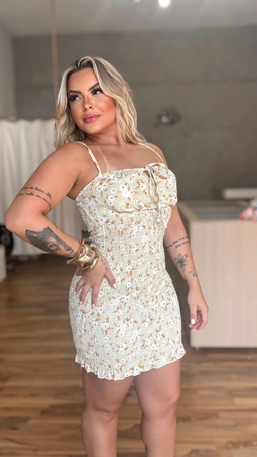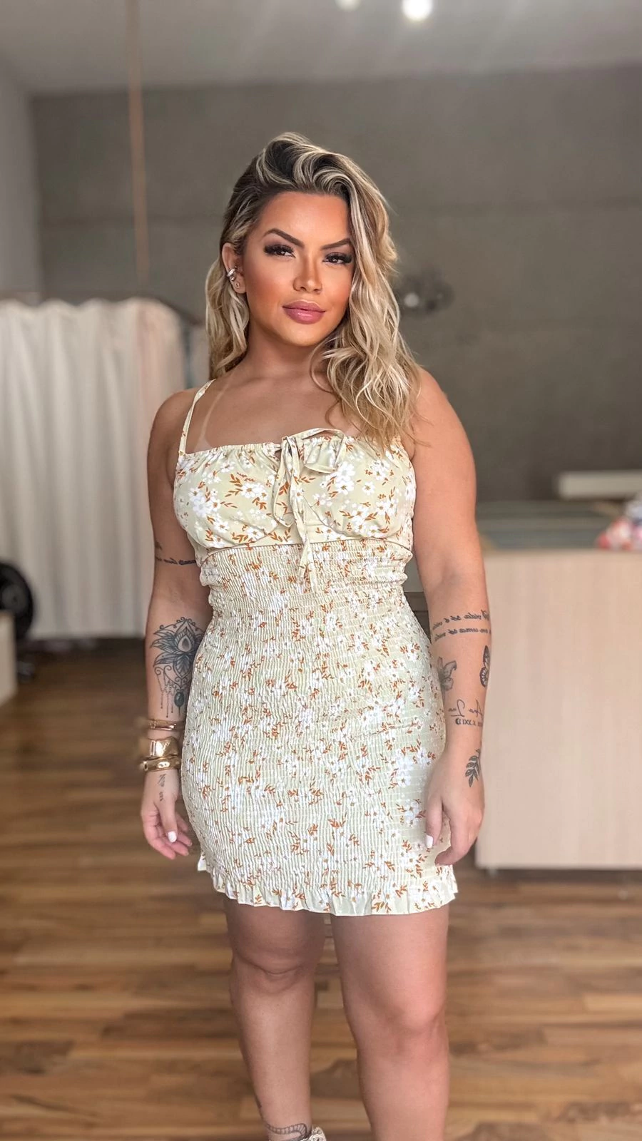 Vestido curto confeccionado em lastex na parte de trás e detalhes em franzido na parte frontal, com amarração no busto e costas proporcionando ainda mais sensualidade a peça, ele se ajusta ao corpo vestido do PP ao G.
