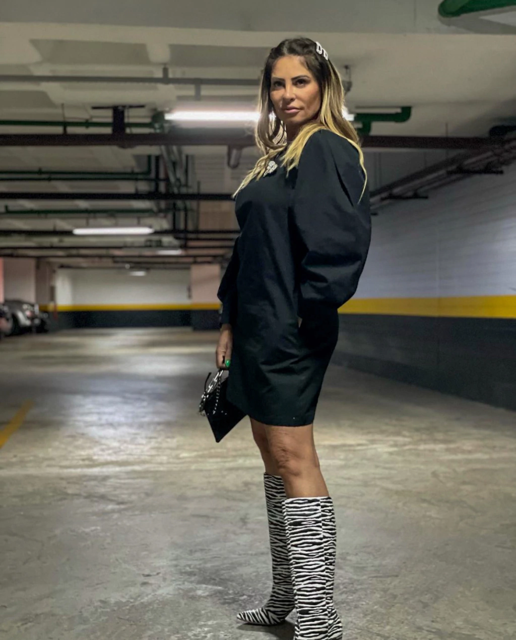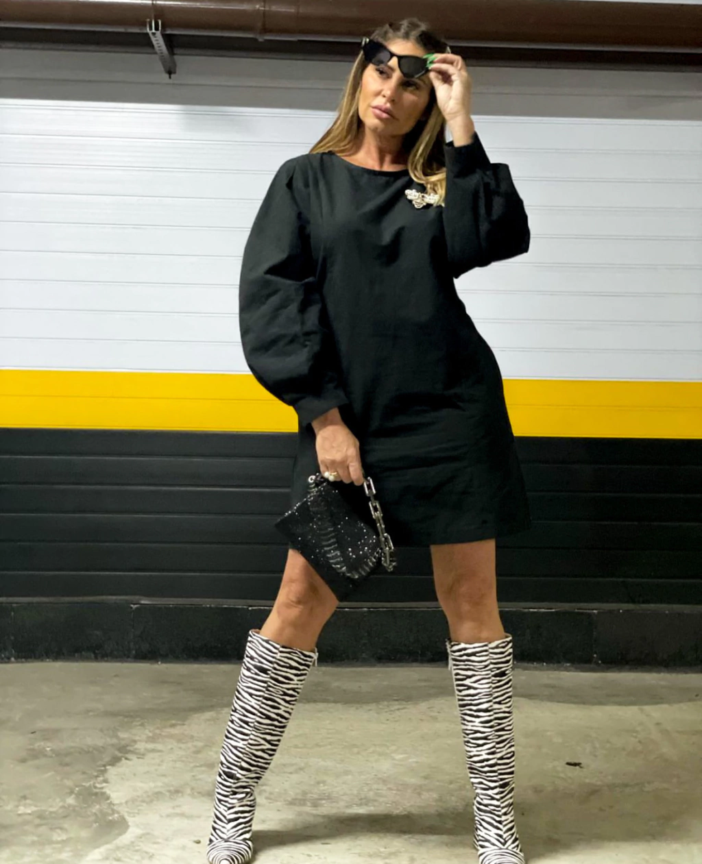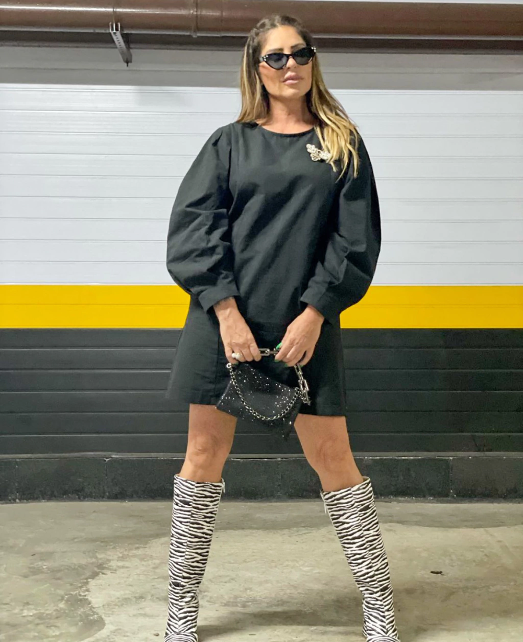 Vestido en tricoline com mangas bufantes, bolsos e possui broche abelha.